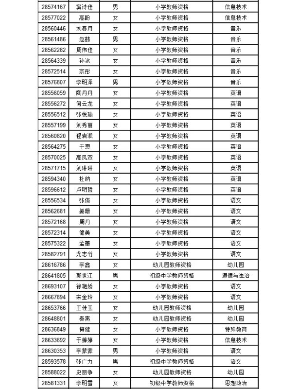 2020年秋季,科爾沁區(qū)教育體育局受理的初中教師、小學(xué)教師和幼兒園教師資格認(rèn)定申請(qǐng)人共計(jì)234名,經(jīng)過網(wǎng)上報(bào)名、體檢、現(xiàn)場(chǎng)確認(rèn)、非師范教育類人員教學(xué)基本素質(zhì)和能力測(cè)試及考察等程序,擬認(rèn)定下列176名申請(qǐng)人符合申請(qǐng)的相應(yīng)教師資格,現(xiàn)將擬通過人員名單予以公示(人員名單見附件),公示期5個(gè)工作日(2020年12月10日至12月14日),公示期間接受群眾來信、來電、來訪。聯(lián)系方式: 04758234645(區(qū)教體局人事股)、04758239937(區(qū)教體局監(jiān)察室)2020年秋季科爾沁區(qū)教師資格認(rèn)定擬通過人員名單