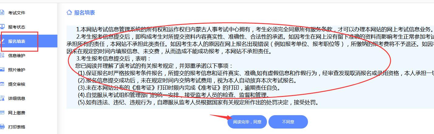1、進入報名填表頁面,需要先閱讀。閱讀完畢點擊同意。