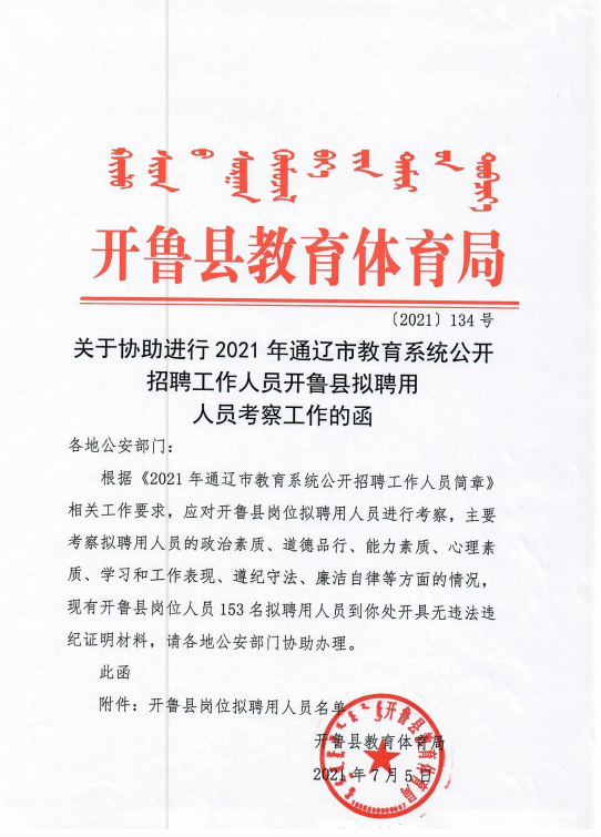 2.關(guān)于協(xié)助進(jìn)行2021年通遼市教育系統(tǒng)公開招聘工作人員開魯縣崗位人員考察工作的函