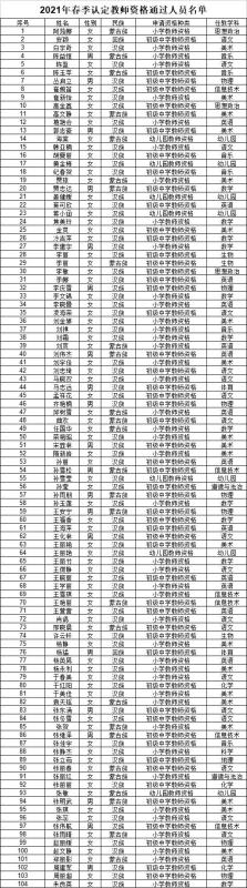 2021年春季開(kāi)魯縣教育體育局受理的初中、小學(xué)和幼兒園教師資格認(rèn)定申請(qǐng)人共計(jì)193人,經(jīng)過(guò)網(wǎng)上報(bào)名、體檢、現(xiàn)場(chǎng)確認(rèn)、非師范類(lèi)人員教育教學(xué)能力測(cè)試和考察等程序,認(rèn)定下列104名申請(qǐng)人符合申請(qǐng)的教師資格條件,現(xiàn)將通過(guò)人員名單予以公示(名單附后)。請(qǐng)通過(guò)人員于2021年7月26日后攜帶本人身份證到開(kāi)魯縣教育體育局人事股315室領(lǐng)取。
