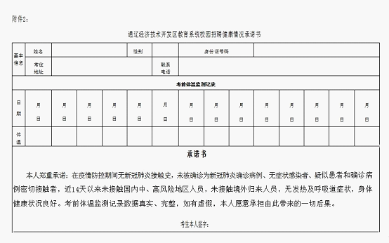 (三)考生應(yīng)做好身體健康狀況監(jiān)測。即日起考生記錄體溫測量結(jié)果,并填寫《通遼經(jīng)濟(jì)技術(shù)開發(fā)區(qū)教育系統(tǒng)校園招聘健康情況承諾書》(附件),參加面試時(shí)須上報(bào)給考點(diǎn),方能參加面試。