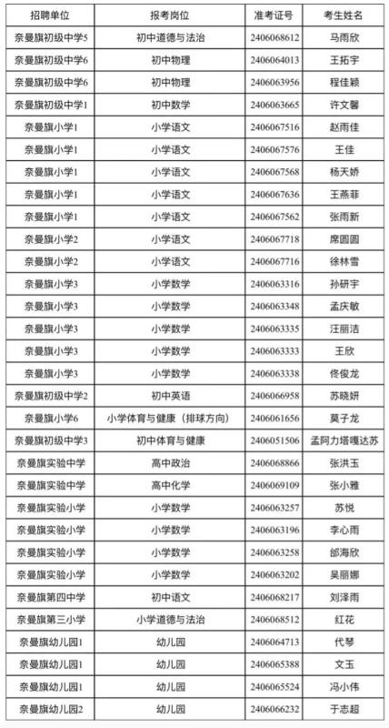 根據(jù)《2024年度通遼市教育系統(tǒng)公開招聘工作人員公告》要求,經(jīng)過筆試、面試、體檢、考察等環(huán)節(jié),現(xiàn)對2024年度通遼市教育系統(tǒng)公開招聘工作人員(奈曼旗崗位)應(yīng)屆畢業(yè)生擬聘用工作人員予以公示。